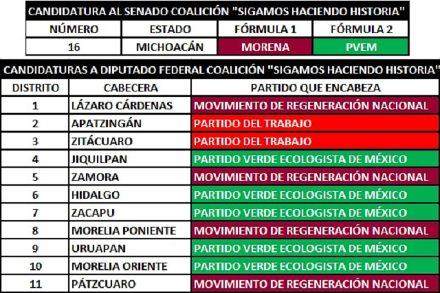 De acuerdo al “convenio” de coalición firmado y registrado ante el Instituto Nacional Electoral por los partidos Movimiento de Regeneración Nacional, Del Trabajo y Verde Ecologista de México, al Partido del Trabajo le tocará “siglar” solo 2 candidaturas a diputado federal, siendo ellas, el distrito 2 con cabecera en Apatzingán y el distrito 3 con cabecera en Zitácuaro.