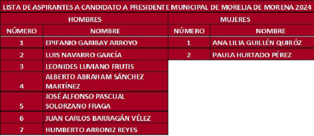 | LISTA DE ASPIRANTES A CANDIDATO A PRESIDENTE MUNICIPAL DE MORELIA DE MORENA 2024 | |||