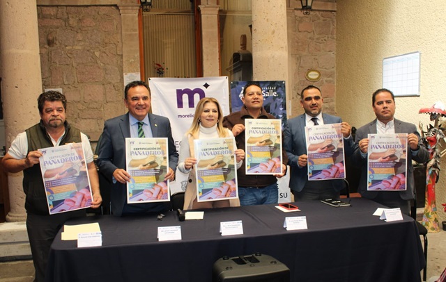 Morelia, Michoacán; a 11 de enero del 2024.- Con el objetivo de coadyuvar en la aplicación de conocimientos en función de mercado, imagen, precio, producción, así como aspectos legales y de mejora continua, el Gobierno Municipal encabezado por el Presidente Alfonso Martínez Alcázar, a través de la Secretaría de Fomento Económico (SEFECO) en colaboración con la Universidad La Salle, presentó la 1er Certificación de Panaderos.