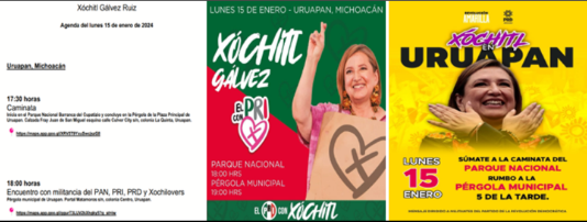 Es tan evidente que a los partidos políticos que integran en Michoacán el Frente Fuerza y Corazón por México, que la campaña de su candidata presidencial XOCHILT GÁLVEZ les vale puritita madre, que ni siquiera para invitar a la ciudadanía de Michoacán, particularmente a la de uruapan, al cierre de la precampaña este lunes, que en los avisos e invitaciones los tres partidos, tieneN horarios diferentes, lo que revela que falta coordinación entre esos partidos y los coordinadores de la campaña de XOCHILT.