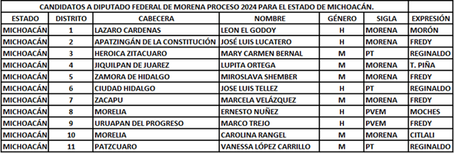 Por lo que corresponde a nuestro estado, se hicieron públicos los nombres de quienes asumirán las candidaturas en los 11 distritos en que está dividido nuestro estado, listado integrado mayoritariamente por desconocidos y a la vez, con “los mismos de siempre” y alguna “sorpresa” que dejó perplejo a más de un morenista, pues se utilizó el siglado por otro partido, para justificar el otorgarles una candidatura a personajes son mérito alguno.