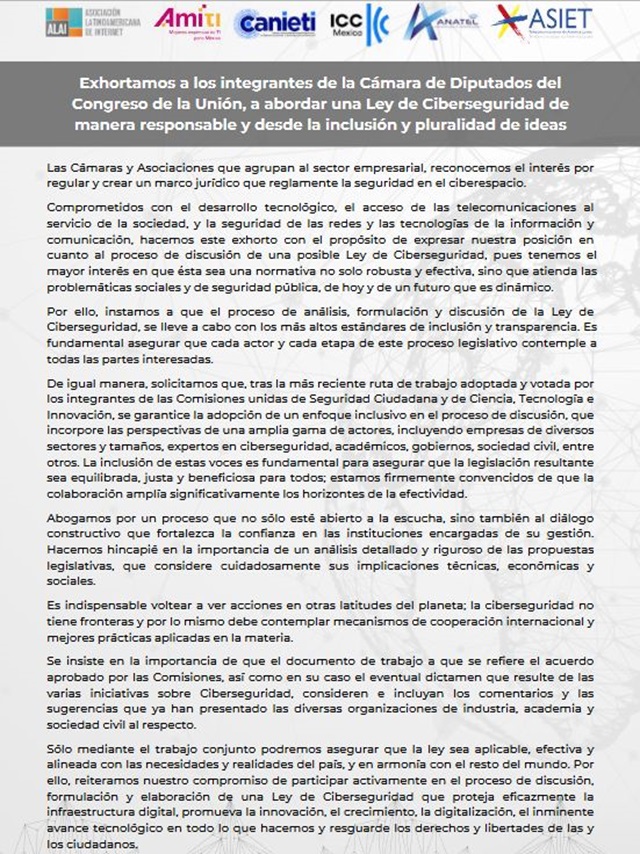 Las Cámaras y Asociaciones que agrupan al sector empresarial, reconocemos el interés por regular y crear un marco jurídico que reglamente la seguridad en el ciberespacio.Comprometidos con el desarrollo tecnológico, el acceso de las telecomunicaciones al servicio de la sociedad, y la seguridad de las redes y las tecnologías de la información y comunicación, hacemos este exhorto con el propósito de expresar nuestra posición en cuanto al proceso de discusión de una posible Ley de Ciberseguridad, pues tenemos el mayor interés en que ésta sea una normativa no solo robusta y efectiva, sino que atienda las problemáticas sociales y de seguridad pública, de hoy y de un futuro que es dinámico.Por ello, instamos a que el proceso de análisis, formulación y discusión de la Ley de Ciberseguridad, se lleve a cabo con los más altos estándares de inclusión y transparencia. Es fundamental asegurar que cada actor y cada etapa de este proceso legislativo contemple a todas las partes interesadas.De igual manera, solicitamos que, tras la más reciente ruta de trabajo adoptada y votada por los integrantes de las Comisiones unidas de Seguridad Ciudadana y de Ciencia, Tecnología e Innovación, se garantice la adopción de un enfoque inclusivo en el proceso de discusión, que incorpore las perspectivas de una amplia gama de actores, incluyendo empresas de diversos sectores y tamaños, expertos en ciberseguridad, académicos, gobiernos, sociedad civil, entre otros. La inclusión de estas voces es fundamental para asegurar que la legislación resultante sea equilibrada, justa y beneficiosa para todos; estamos firmemente convencidos de que la colaboración amplía significativamente los horizontes de la efectividad.Abogamos por un proceso que no sólo esté abierto a la escucha, sino también al diálogo constructivo que fortalezca la confianza en las instituciones encargadas de su gestión. Hacemos hincapié en la importancia de un análisis detallado y riguroso de las propuestas legislativas, que considere cuidadosamente sus implicaciones técnicas, económicas y sociales.Es indispensable voltear a ver acciones en otras latitudes del planeta; la ciberseguridad no tiene fronteras y por lo mismo debe contemplar mecanismos de cooperación internacional y mejores prácticas aplicadas en la materia.Se insiste en la importancia de que el documento de trabajo a que se refiere el acuerdo aprobado por las Comisiones, así como en su caso el eventual dictamen que resulte de las varias iniciativas sobre Ciberseguridad, consideren e incluyan los comentarios y las sugerencias que ya han presentado las diversas organizaciones de industria, academia y sociedad civil al respecto.Sólo mediante el trabajo conjunto podremos asegurar que la ley sea aplicable, efectiva y alineada con las necesidades y realidades del país, y en armonía con el resto del mundo. Por ello, reiteramos nuestro compromiso de participar activamente en el proceso de discusión, formulación y elaboración de una Ley de Ciberseguridad que proteja eficazmente la infraestructura digital, promueva la innovación, el crecimiento, la digitalización, el inminente avance tecnológico en todo lo que hacemos y resguarde los derechos y libertades de las y los ciudadanos.