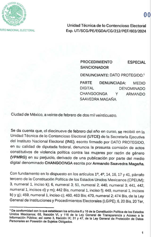 La Unidad Técnica de lo Contencioso Electoral de la Secretaría Ejecutiva del Instituto Nacional Electora, me ha notificado de la denuncia interpuesta en mi contra por la legisladora federal, la que se queja de que, el relacionarla sentimentalmente con otro actor político importante, menoscaba su trayectoria política y, por lo tanto, le causa perjuicio, profesional, moral, psicológico y varias yerbas más.