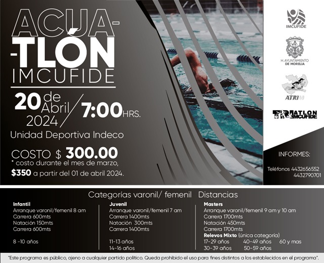 Morelia, Michoacán, a 22 de marzo de 2024.- Con el objetivo de promover un estilo de vida saludable y activo entre las y los morelianos, se llevará a cabo el evento Acuatlón-IMCUFIDE 2024, el próximo sábado 20 de abril en punto de las 07:00 de la mañana.