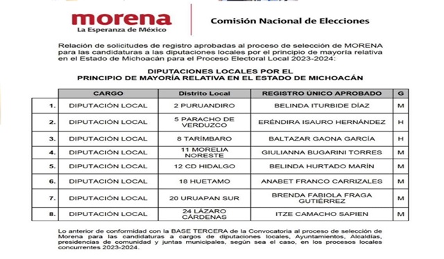 Faltando por definir candidato a diputado local por el distrito 17 con cabecera en Morelia Sureste, Morena y los partidos coaligados del Trabajo y Verde Ecologista de México, definieron a sus candidatos a diputado local en 23 de los 24 distritos electorales locales, ya que este domingo pasado se conoció la última lista oficial en la que aparecen los nombres de los candidatos faltantes.