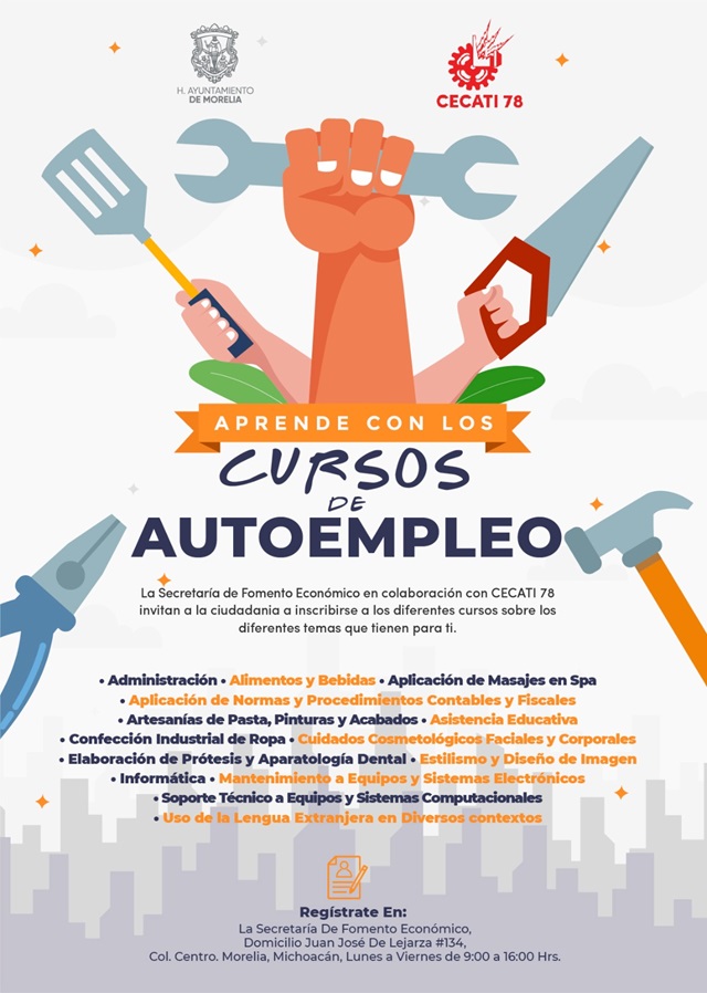 Morelia, Michoacán; 24 de abril de 2024.- Bajo la premisa de coadyuvar en la generación de un emprendedurismo capacitado, la Secretaría de Fomento Económico (SEFECO) en colaboración con el Centro de Capacitación para el Trabajo Industrial (CECATI) No. 78. continúan invitando a la población a participar en el programa “Aprende con Cursos de Autoempleo”.