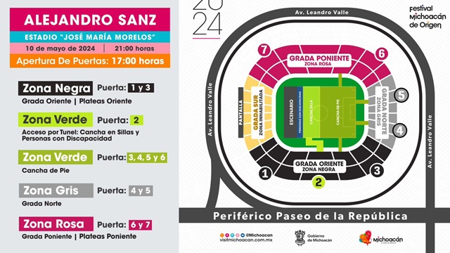 Morelia, Michoacán, 8 de mayo de 2024.- La fecha se acerca para que Alejandro Sanz llegue por primera vez a Michoacán y aquí te contamos cuáles serán los accesos por donde deberás ingresar para ubicar la zona de tu boleto, a partir de las 17:00 horas.