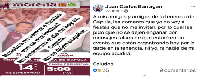 A pesar de que varios actores políticos se esfuerzan por mandar un mensaje de unidad al interior de Morena, pero, sobre todo, al exterior, el diputado local con licencia JUAN CARLOS BARRAGÁN VÉLEZ se cansa de desmentir la dichosa unidad, este martes subió a sus redes avisos de que él no asistiría a un evento organizado por los candidatos de Morena en la Tenencia de Capula.