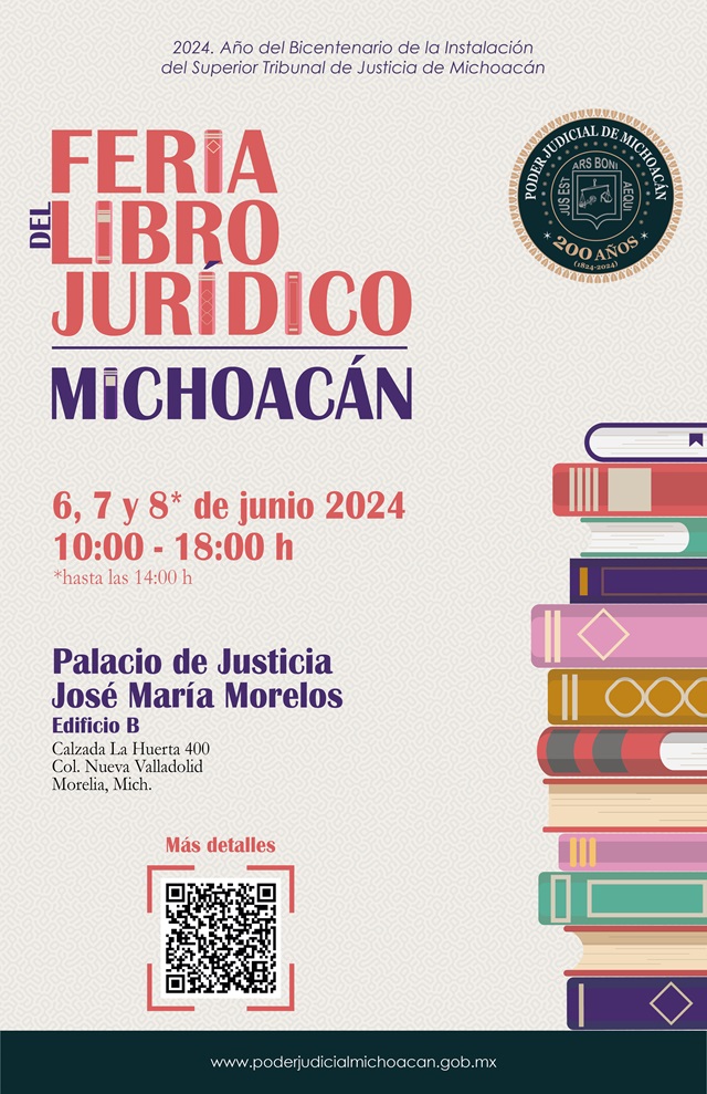 Morelia, Michoacán, 27 de mayo de 2024. Dentro de las actividades en el marco del Bicentenario de la Instalación del Superior Tribunal de Justicia de Michoacán, el Poder Judicial emite la invitación a participar en la Feria del Libro JurídicoMichoacán 2024.