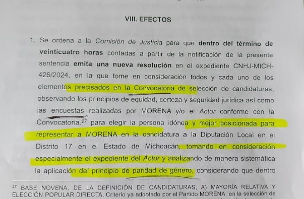 La tarde de este martes 28, la Comisión Nacional de Honestidad y Justicia de Morena, emitió la resolución que el Tribunal Electoral del Estado de Michoacán le ordenó, declarando inoperantes los argumentos de CALDERÓN TORREBLANCA y a consecuencia de ello, ratificó la postulación de PEDRAZA HUERTA, por lo que su candidatura a diputada local por el distrito 17 con cabecera en Morelia Sureste, no sufrió ninguna modificación, pues, al contrario, fue ratificada.