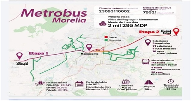 Este martes, los medios de comunicación afines al oficialismo, empezaron a socializar la ejecución del proyecto de obra pública denominado “Metrobús” para la ciudad de Morelia, el que en su primera etapa se implementaría a partir del Fraccionamiento Villas del Pedregal hasta el Obelisco a Lázaro Cárdenas, con una inversión de 2,295 millones de pesos, aunque el proyecto se anuncia, llegaría hasta lo que se conoce como Ciudad Salud, con un recorrido de 28 kilómetros.