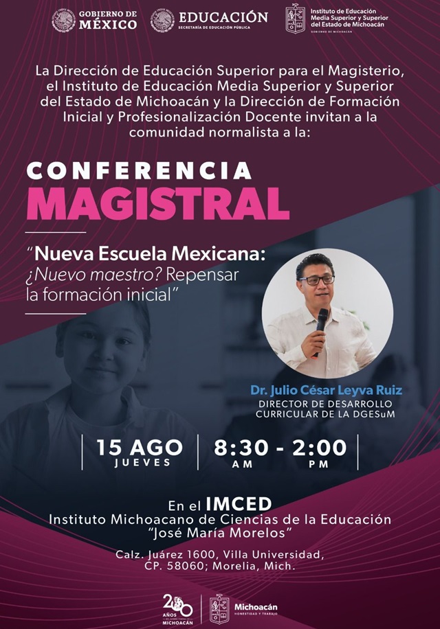 Morelia, Michoacán, 14 de agosto de 2024.- El Instituto de Educación Media Superior y Superior del Estado (Iemsysem) invita a la comunidad normalista de Michoacán a la conferencia magistral “Nueva Escuela Mexicana: ¿Nuevo maestro? Repensar la formación inicial”, a realizarse mañana jueves 15 de agosto en el auditorio del Instituto Michoacano de Ciencias de la Educación (IMCED).
