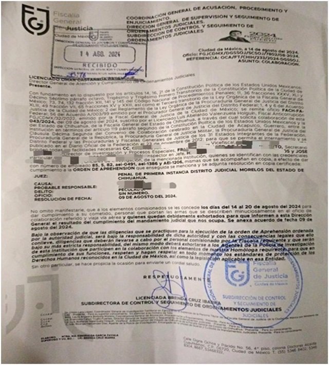 Con la orden de aprehensión en la mano, personal de la Fiscalía Especializada en Combate a la Corrupción del estado de Chihuahua, hizo acto de presencia en la Ciudad de México ante funcionarios de la Fiscalía capitalina, ante quienes presentó la orden de aprehensión correspondiente, así como el oficio de solicitud de colaboración para ejecutar la orden de captura, los que recibieron autorización para actuar en la capital del 14 al 20 de agosto de 2024.