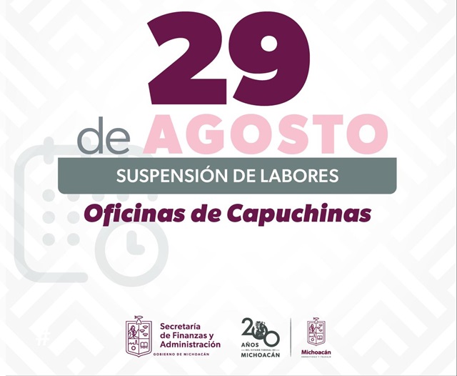 Morelia, Michoacán, 29 de agosto de 2024.- La Secretaría de Finanzas y Administración, a través del Servicio de Administración Tributaria del Estado de Michoacán (SATMICH), informa que este jueves no abrirá la oficina receptora que opera en Capuchinas, en el Centro Histórico de Morelia, ya que en el lugar se llevará a cabo una reunión de trabajo con administradores y receptores de Rentas.