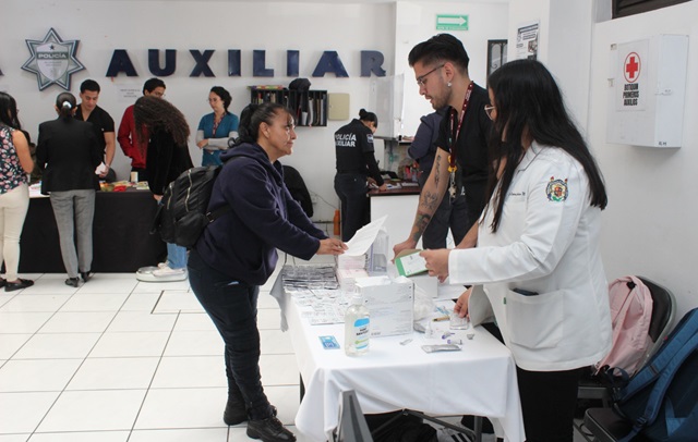 Morelia, Michoacán, 9 de noviembre de 2024.- Como parte de las acciones que implementa la Policía Auxiliar de Michoacán para contribuir en el cuidado de la salud física y mental de las y los trabajadores, se llevó a cabo una Feria de la Salud en coordinación con la Jurisdicción Sanitaria No. 1 de la Secretaría de Salud (SSM).