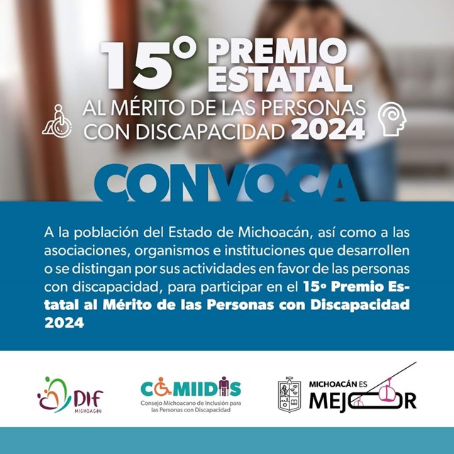Morelia, Michoacán, 10 de noviembre de 2024.- El Gobierno del Estado, a través del Sistema DIF Michoacán y el Consejo Michoacano para la Inclusión de las Personas con Discapacidad, convoca a la población, asociaciones, organismos e instituciones que desarrollen o se distingan por sus actividades en favor de las personas con discapacidad, a participar en el 15 Premio Estatal al Mérito de las Personas con Discapacidad 2024.