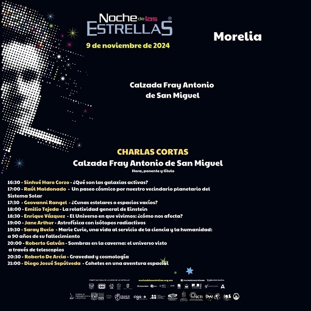 El programa completo puede consultarse en la página de Facebook “Noche de las Estrellas Morelia”, e incluye pláticas, talleres y exhibiciones para todas las edades sobre astronomía, ciencias espaciales, radioactividad y mujeres en la ciencia, así como la proyección del video “Explorando el Sistema Solar” en el planetario móvil, y presentaciones musicales desde el balcón del UNAM Centro Cultural Morelia.