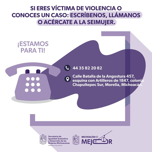 Morelia, Michoacán, 12 de noviembre de 2024.- Con la firmeza de defender y fortalecer los derechos de las mujeres, la Secretaría de Igualdad Sustantiva y Desarrollo de las Mujeres Michoacanas (Seimujer) da atención gratuita a mujeres víctimas de violencia y a sus hijas e hijos, informó la titular Alejandra Anguiano González.