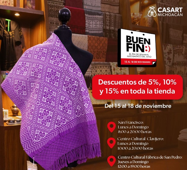 Morelia, Michoacán, 13 de noviembre de 2024.- El Buen Fin llega a Casa de las Artesanías (Casart) con descuentos del 5, 10 y 15 por ciento en todas las piezas, del 15 al 18 de noviembre.