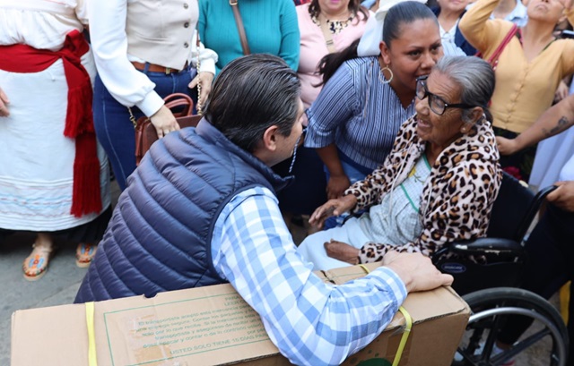 A su llegada, Alfonso Martínez, saludó alegremente a las y los vecinos de San Nicolás Obispo, mientras avanzaba a la plaza principal y se tomaba fotografías con artesanas y artesanos.