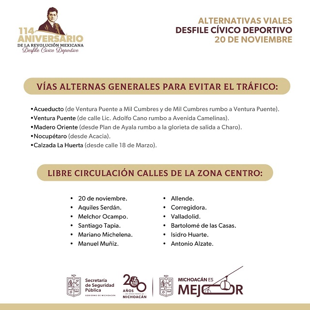 A las 6:00 horas se cerrará la avenida Acueducto desde la avenida Tata Vasco y Ventura Puente; y a partir de las 10:00 horas, cuando inicie el desfile deportivo, se cerrará de Tres Puentes hasta la avenida Madero, calzada La Huerta hasta la calle 18 de Marzo, y la avenida Nocupétaro hasta la calle Acacia, con la finalidad de que se desarrolle sin incidentes.