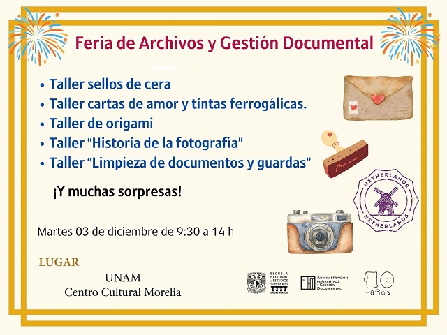 Los festejos del 10º aniversario de la licenciatura en Administración de Archivos y Gestión Documental se realizarán este 02 y 03 de diciembre de 9:30 a 14 horas en el UNAM Centro Cultural Morelia, ubicado en la Av. Acueducto #19, Col. Centro Histórico, Morelia, Michoacán. Para mayores informes pueden consultar las redes sociales de la UNAM Centro Cultural Morelia o WhatsApp 443 410 0517.