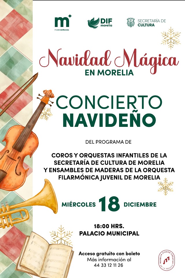 Morelia, Michoacán; 03 de diciembre de 2024.- A través de la Secretaría de Cultura Municipal, el Gobierno de Morelia invita al Concierto Navideño que presentarán las y los niños que forman parte del Programa de Coros y Orquestas Infantiles el próximo 18 de diciembre, como parte del compromiso que tiene la capital del estado en su nombramiento de Ciudad Creativa de la Música.