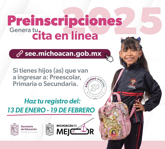 El trámite será a través de la página https://dti.see.michoacan.gob.mx/sistema-integral-see/preinscripciones, que se habilitará el 13 de enero; para sacar la cita solo se requiere la CURP del alumno, teléfono y correo electrónico personal del padre o tutor. Al ingresar la información adicional requerida se generará la cita conforme los días y hora disponibles y les llegará el comprobante a su correo electrónico.