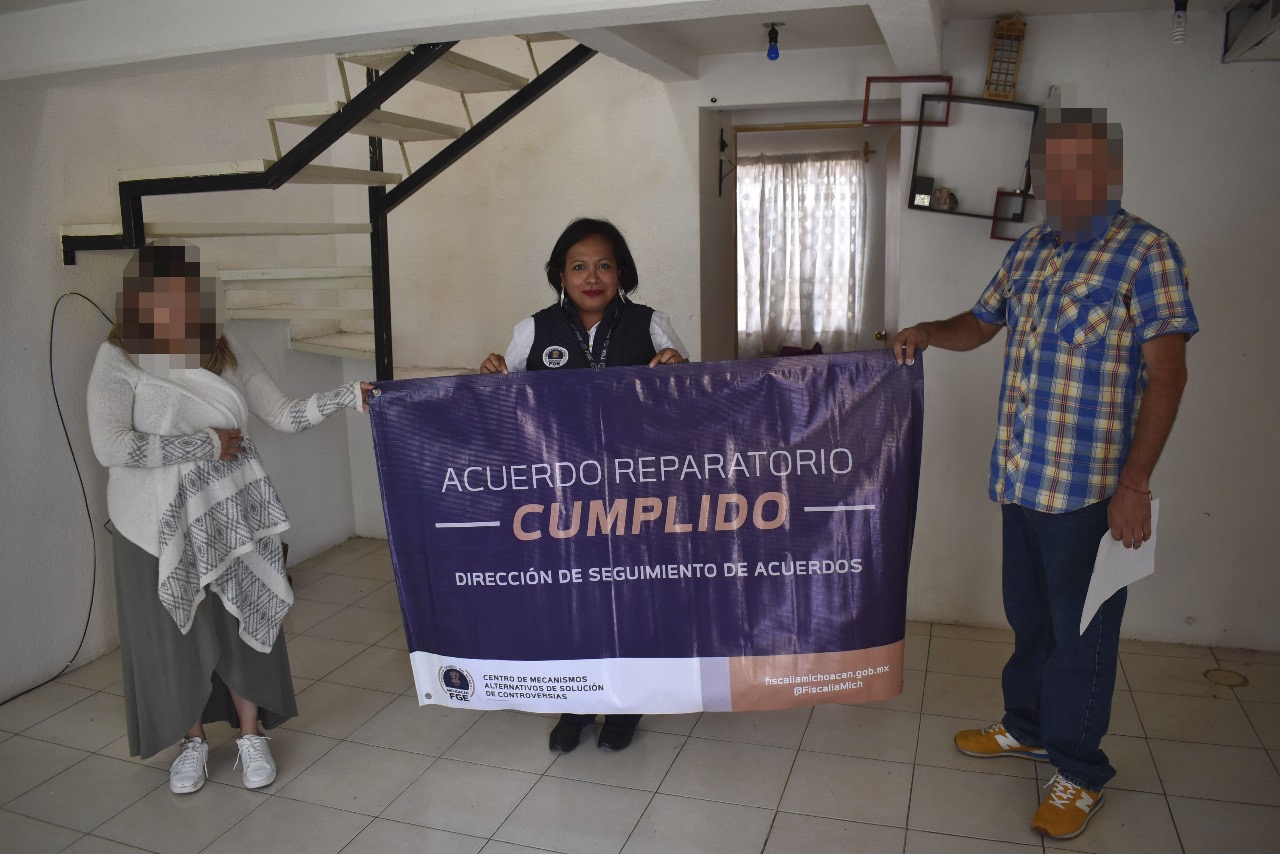 Morelia, Michoacán, a 21 de diciembre de 2024.- La Fiscalía General del Estado de Michoacán (FGE), a través del Centro de Mecanismos Alternativos de Solución de Controversias (CMASC), celebró un acuerdo reparatorio y restituyó un inmueble en favor de una mujer víctima de despojo, cometido en Tarímbaro.