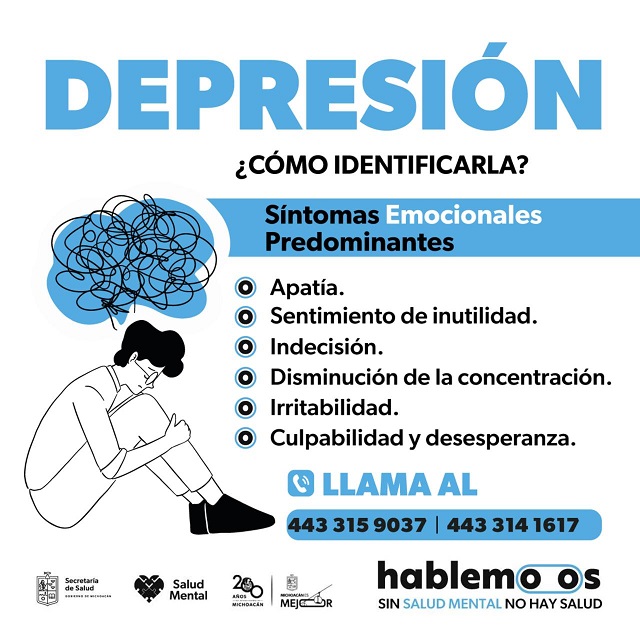 Morelia, Michoacán, a 23 de diciembre de 2024.- El 24 y 25 de diciembre, la Secretaría de Salud de Michoacán (SSM) atenderá la depresión estacional de manera gratuita, en los teléfonos 4433341617 y 4433159037 de la línea Hablemoos, la cual opera las 24 horas del día con psicólogos especializados, así como en 40 centros de salud y en el Hospital Psiquiátrico.