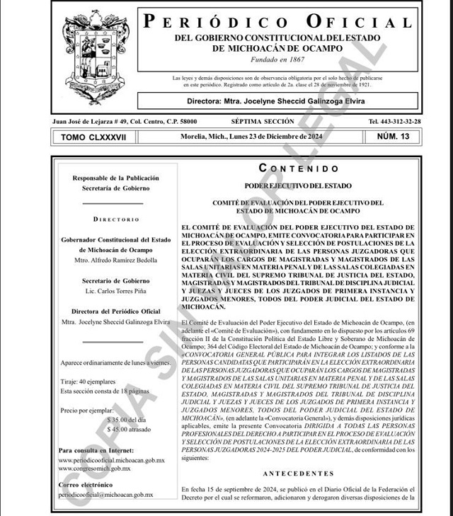 Morelia, Michoacán, 24 de diciembre de 2024.- El Comité de Evaluación publica la convocatoria para que las y los profesionales del derecho participen en el proceso de selección de magistradas, magistrados, juezas y jueces del Poder Judicial de Michoacán.