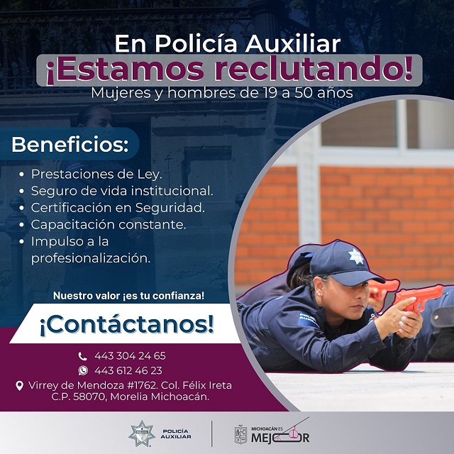 Para más información sobre requisitos, proceso de inscripción y fechas límite, las y los interesados podrán visitar el sitio oficial: www.policiaauxiliar.michoacan.gob.mx; o comunicarse a través de las redes oficiales en Facebook: Policía Auxiliar del Estado de Michoacán de Ocampo y en Instagram: policia.auxiliar.michoacan, al teléfono 443 304 2465, por WhatsApp al número 443 612 4623; o acudir directamente a las oficinas ubicadas en la calle Virrey de Mendoza #1762, colonia Félix Ireta, en Morelia.