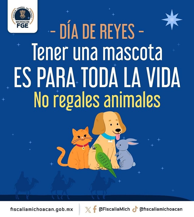 Morelia, Michoacán, a 4 de enero de 2025.- En el marco de las actividades del Día de Reyes, la Fiscalía General del Estado de Michoacán, a través de la Unidad de Investigación y Persecución del Delito de Maltrato Animal, adscrita a la Fiscalía Especializada en Delitos Contra el Medio Ambiente y la Fauna, participará activamente en operativos especiales en diversos puntos de la capital, encabezados por el Ayuntamiento de Morelia.