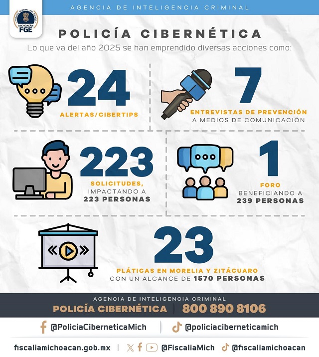 Estas actividades reflejan el compromiso constante de la Policía Cibernética de Michoacán con la protección y el bienestar de la ciudadanía en el entorno digital; además de seguir trabajando para fortalecer las estrategias preventivas que permitan reducir los riesgos asociados al uso de las tecnologías de la información, promoviendo así un espacio digital más seguro y accesible para todas y todos.
