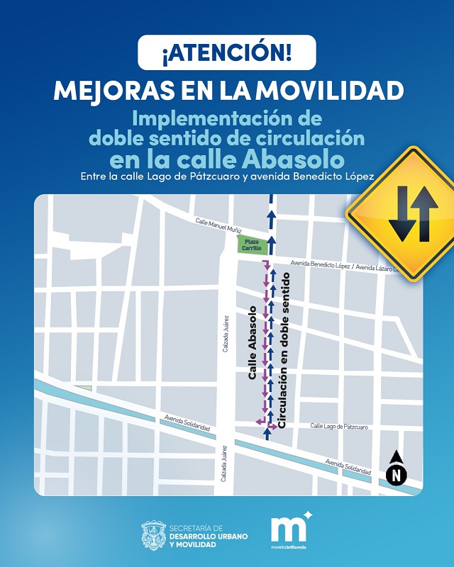 • La calle Abasolo tendrá circulación en doble sentido entre la calle Lago de Pátzcuaro y la Avenida Benedicto López.