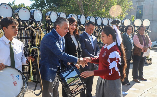 Morelia, Michoacán, 18 de marzo de 2025.- Con el objetivo de fomentar valores cívicos, disciplina, organización, trabajo en equipo y el gusto por la música, la secretaria de Educación, Gaby Molina, hizo entrega de 50 bandas de guerra a igual número de escuelas de primaria y secundaria en 29 municipios.