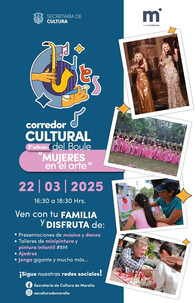 Morelia, Michoacán; 20 de marzo de 2025.- El Gobierno de Morelia que encabeza el presidente municipal, Alfonso Martínez Alcázar, a través de la Secretaría de Cultura invita a la tercera edición del Corredor Cultural del Boule, que en esta ocasión tendrá como temática “Mujeres en el arte”, en el marco del 8M, Día Internacional de la Mujer.