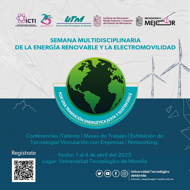 Morelia, Michoacán, 24 de marzo de 2025.- La rectora de la Universidad Tecnológica de Morelia (UTM), Graciela C. Andrade García Peláez, anunció la realización de la Semana Multidisciplinaria de la Energía Renovable y la Electromovilidad. Este evento se llevará a cabo del 1 al 4 de abril en las instalaciones de la universidad y forma parte del programa de actividades por el 25 aniversario de la institución.