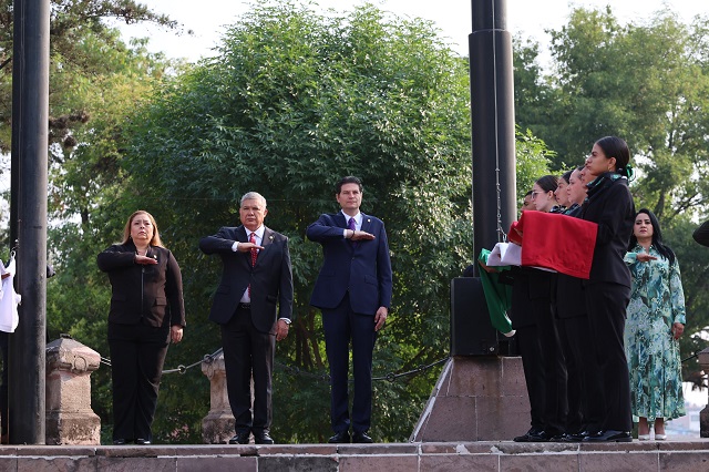 La Plaza Jardín Morelos fue el sitio donde se rindieron honores a la bandera nacional, estatal y municipal, con presencia de personalidades de todos los órdenes de gobierno.