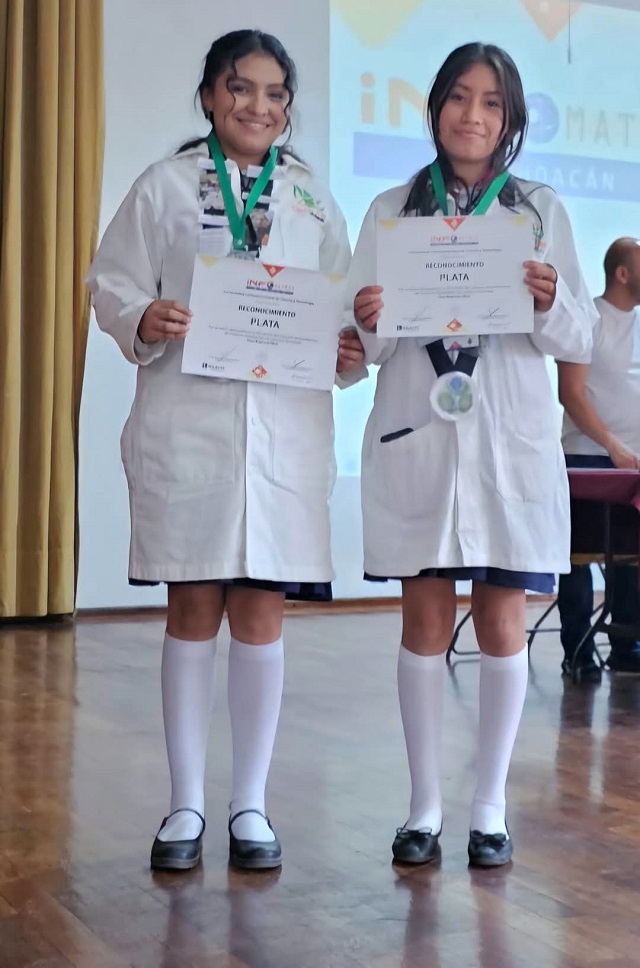 Ixtlahuaca de Rayón, Estado de México, 21 de mayo de 2025.- Las alumnas Jessica Nayeli Martínez Ramírez y Juana Isabel Suárez Rodríguez del Colegio de Estudios Científicos y Tecnológicos del Estado de Michoacán (Cecytem) participan en Infomatrix Nacional que se desarrolla en el Estado de México del 21 al 24 de mayo del mes en curso.