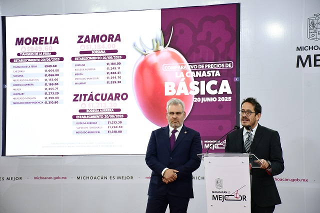Morelia, Michoacán, 23 de junio de 2025.- El titular de la Secretaría de Desarrollo Económico (Sedeco) informó que, en el monitoreo semanal de precios, Morelia se posicionó nuevamente como el municipio con el precio más bajo en la canasta básica, con un costo de 949 pesos en el tianguis de la Feria. Este punto de venta popular registró el menor precio estatal, seguido por Bodega Aurrera con mil 256 pesos, Merza con mil 273, Walmart con mil 290, el Mercado San Juan con mil 311, y el Mercado Independencia con mil 184.