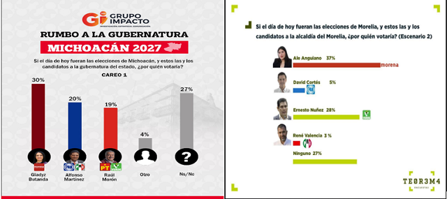 Como se puede apreciar en las graficas anteriores, hay dos “resultados” de tales levantamientos en los que es tal el ridículo, cuando por ejemplo, la levantada por el denominado “Grupo Impacto”, miden al profesor RAÚL MORÓN ORÓZCO como aspirante al que presuntamente, postularían los partidos Verde Ecologista de México y del Trabajo, cuando MORÓN es un militante de Morena perfectamente identificado, empero, es obvia la intención de hacer estas publicaciones, para inducir un deslinde del profesor del partido oficial. Qué pena produce una empresa encuestadora que se presta a ese tipo de maniobras ridículas.