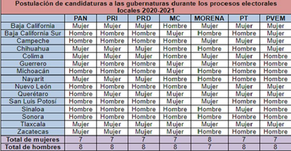 Así las cosas, el consejo general del INE estableció dichos lineamientos estableciendo en términos generales, que de las 15 gubernaturas en juego para el proceso electoral 2020-2021, los partidos políticos deberían de postular al menos a 7 mujeres, disposición que todos los partidos político cumplieron, inclusive, en el caso de Morena, postuló a 8 mujeres, mientras que los demás los 7 ordenados, como se observa en la grafica anterior, se establece no solo el número de candidatos sino también los estados de la república con la decisión de cada partido político.