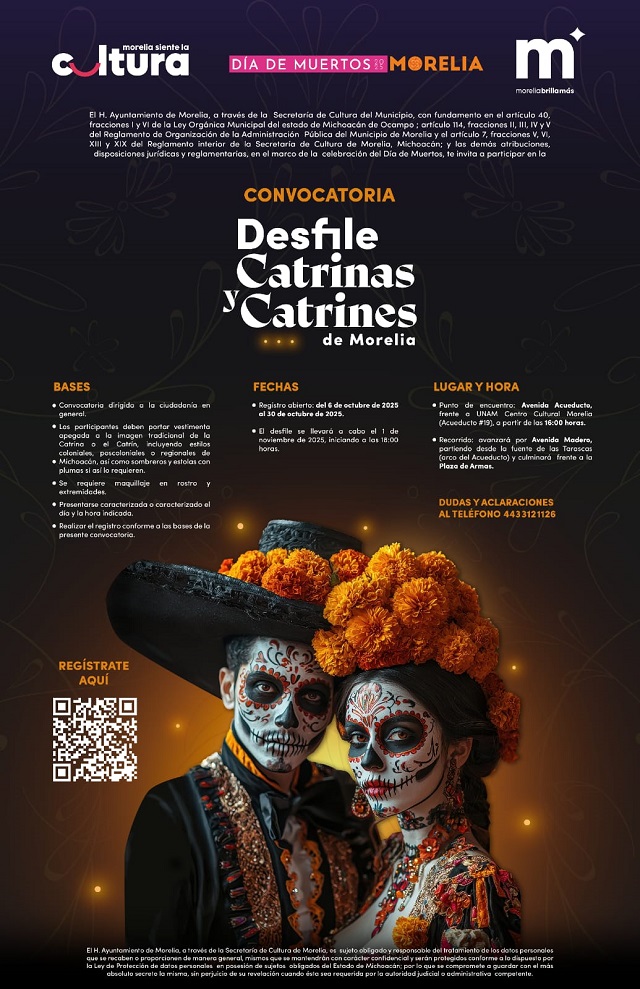 Morelia, Michoacán; 24 de octubre de 2025.- El Gobierno de Morelia que encabeza el presidente municipal, Alfonso Martínez Alcázar, por medio de la Secretaría de Cultura (Secultura) reitera la invitación a la ciudadanía en general para participar en la edición 2025 del Desfile de Catrinas y Catrines, que se realizará el próximo primero de noviembre en el centro histórico.