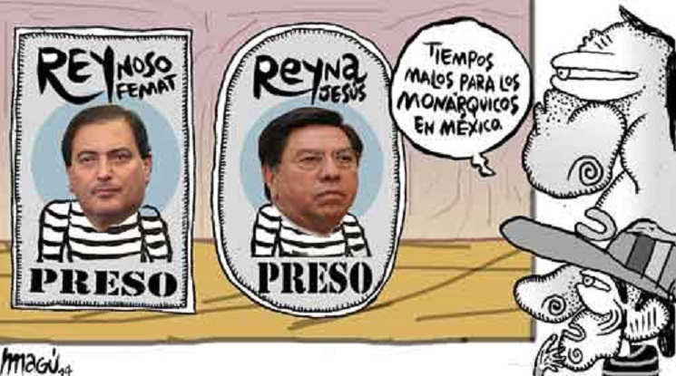 Joaquín López-Dóriga EN PRIVADO Cuatro ex gobernadores presos09/05/14 Con la consignación, el jueves, de Jesús Reyna ante un juez del penal federal del Altiplano, suman cuatro los ex gobernadores presos, de lo que no había antecedente, aunque en 2012 llegó a haber tres. Con Reyna, gobernador interino de Michoacán a las licencias del titular Fausto Vallejo, están en la cárcel Andrés Granier, que lo fue de Tabasco por una denuncia multimillonaria que abarca recursos federales; Luis Armando Reynoso, de Aguascalientes, por peculado, y Mario Villanueva Madrid, de Quintana Roo, en un proceso por delincuencia organizada que aquí libró, pero en Estados Unidos no, y permanece preso en Nueva York. Son tres priistas, Reyna, Granier y Villanueva, y un panista, Reynoso. Dos de ellos por razones de dinero, Granier y Reynoso, y dos por delincuencia organizada, Reyna y Villanueva. El único referente data de 2012, cuando en forma simultánea estuvieron en la cárcel tres ex gobernadores: Pablo Salazar Mendiguchía, de Chiapas; Narciso Agúndez, de Baja California Sur, y el mismo Villanueva Madrid. http://www.milenio.com/firmas/joaquin_lopez-doriga/ex-gobernadores-presos_18_295950446.html